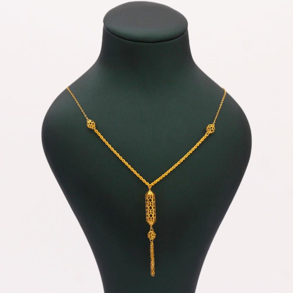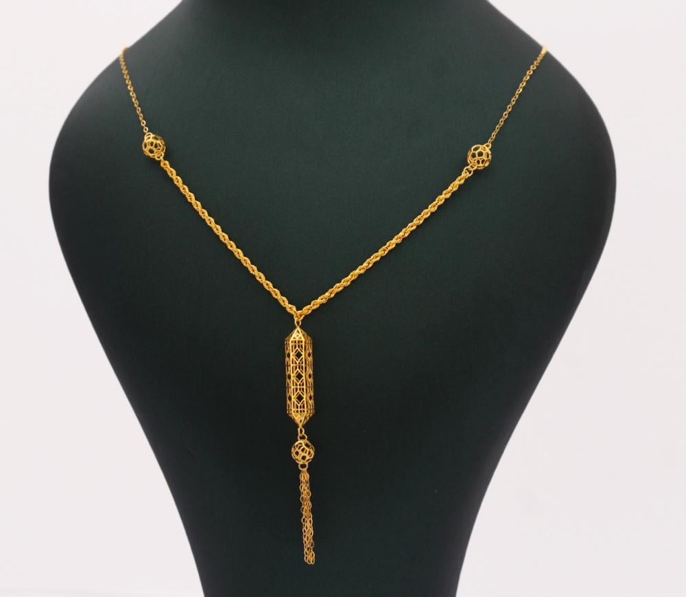 عقد ذهب خالص بتصميم فخم ، ولافت، وطول أنيق ينساب على الرقبة بكل تألق،