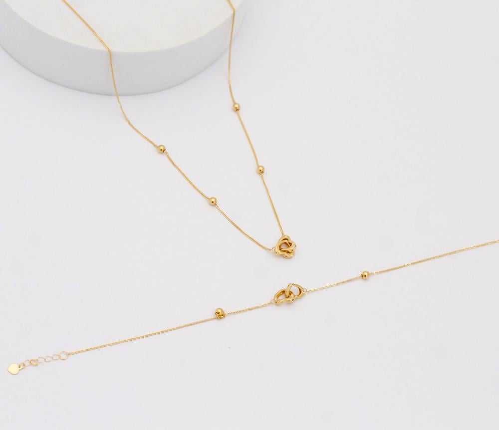 عقد واسوارة ذهب خالص بتصميم فخم ، ولافت، وطول أنيق ينساب على الرقبة بكل تألق،