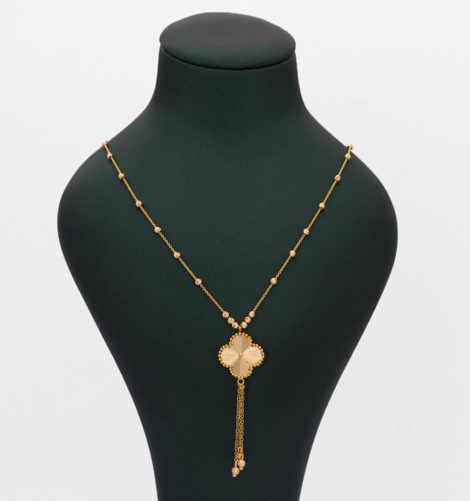 قلادة ذهب خالص بتصميم فخم ، ولافت، وطول أنيق ينساب على الرقبة بكل تألق،