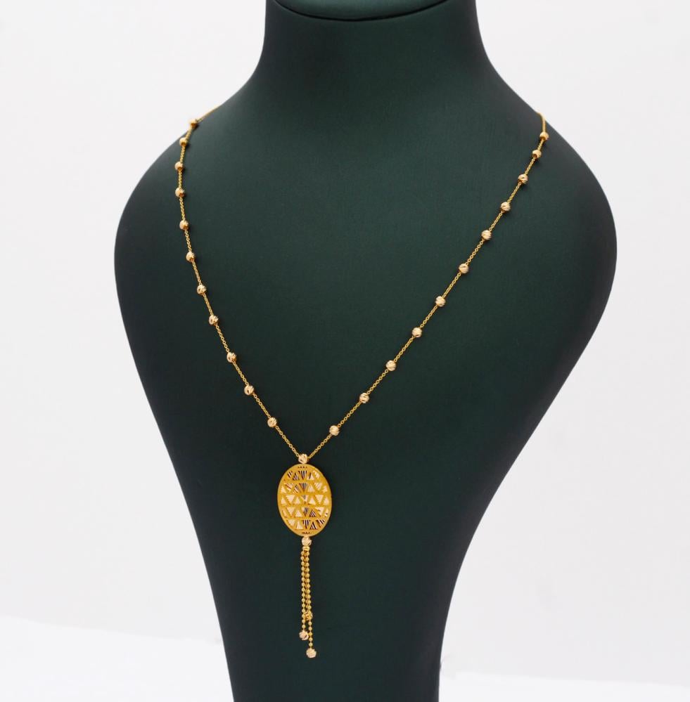 A pure gold necklace with a luxurious, eye-catching design, and an elegant length that flows on the neck with all its brilliance.