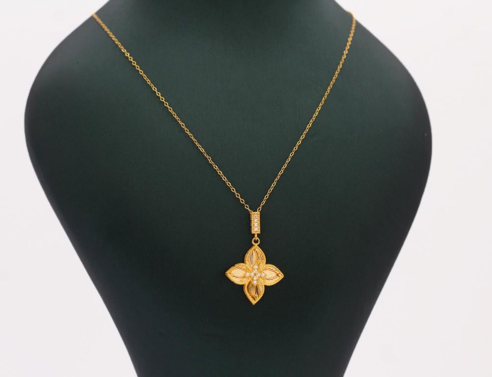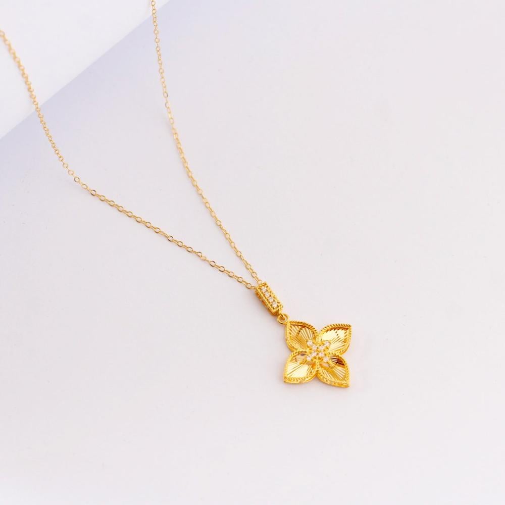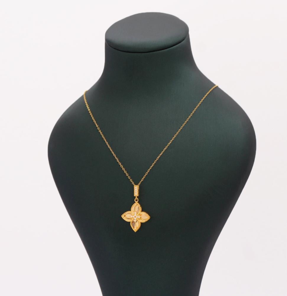 A pure gold necklace with a luxurious, eye-catching design, and an elegant length that flows on the neck with all its brilliance.