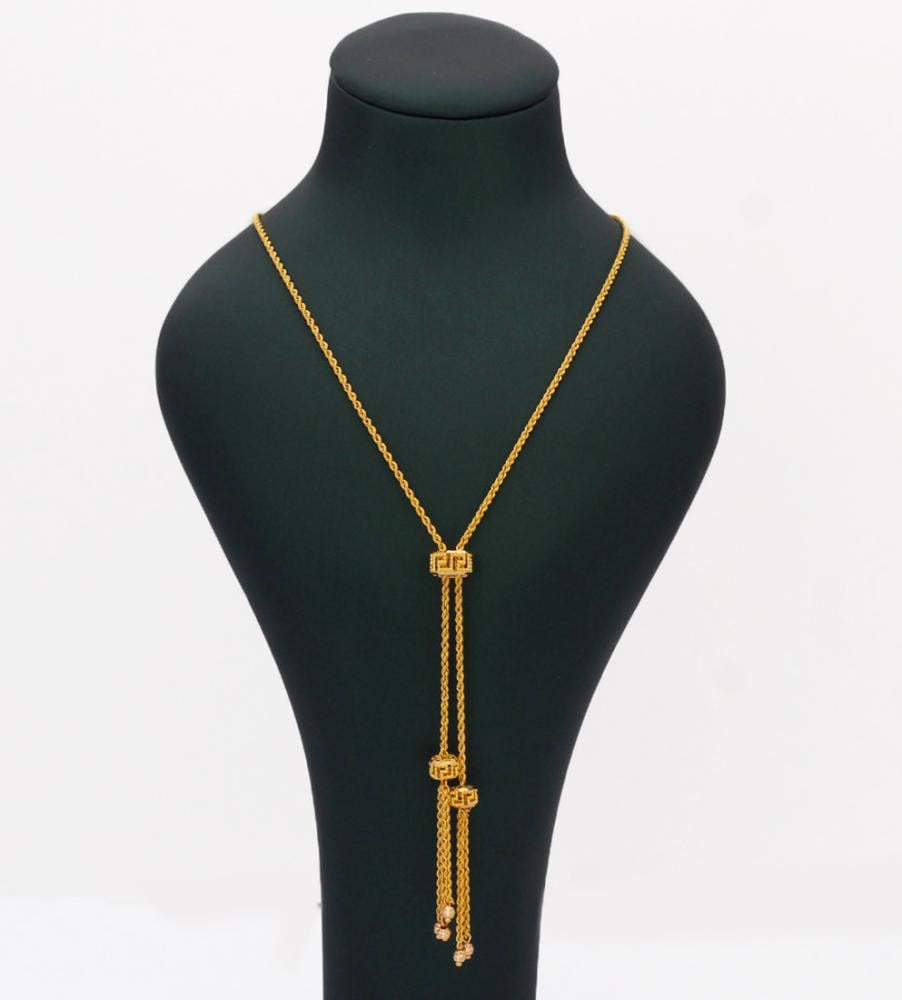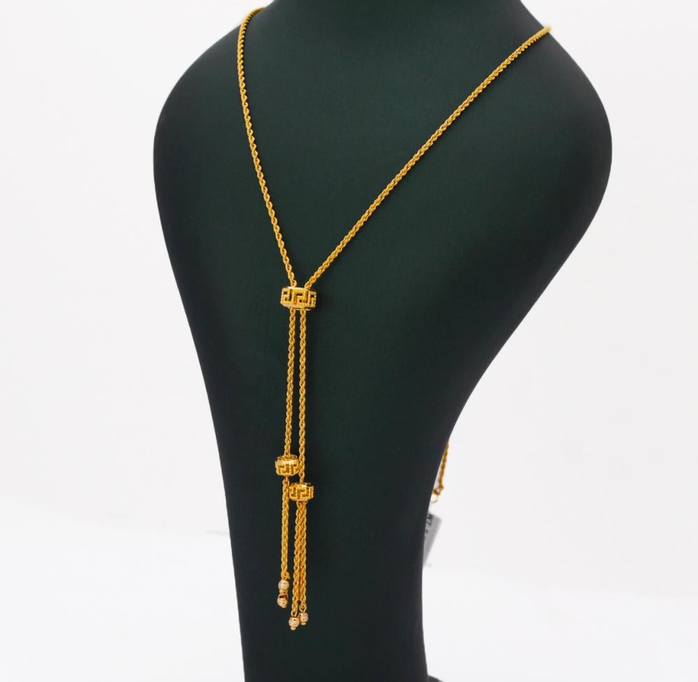 A pure gold necklace with a luxurious, eye-catching design, and an elegant length that flows on the neck with all its brilliance.