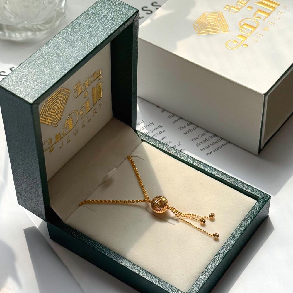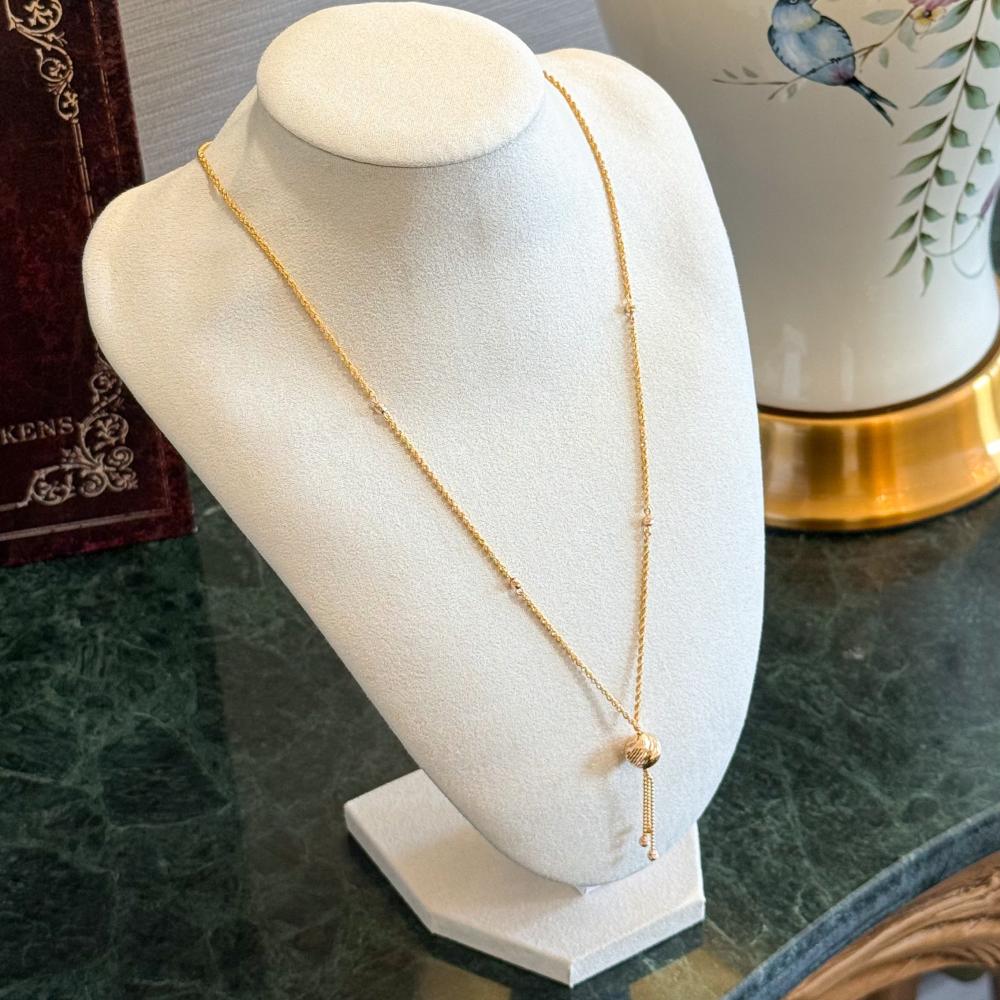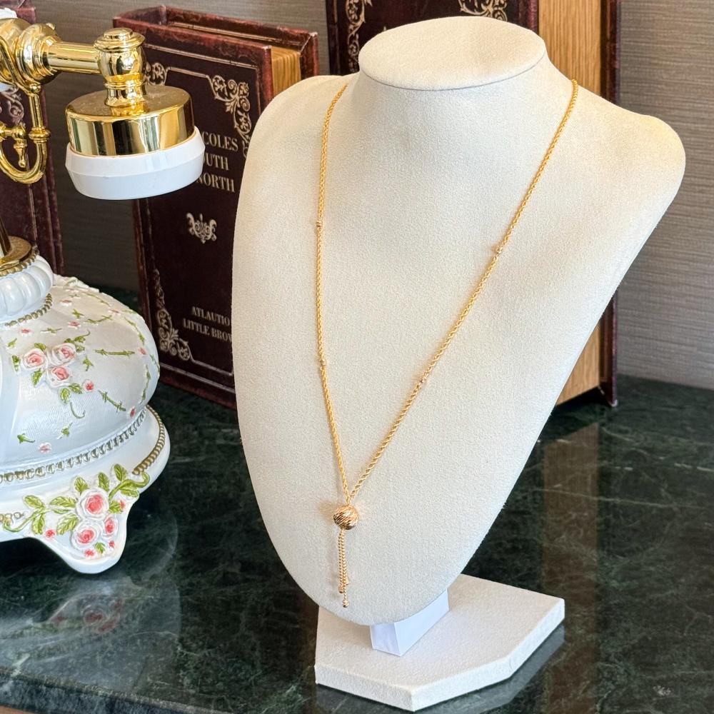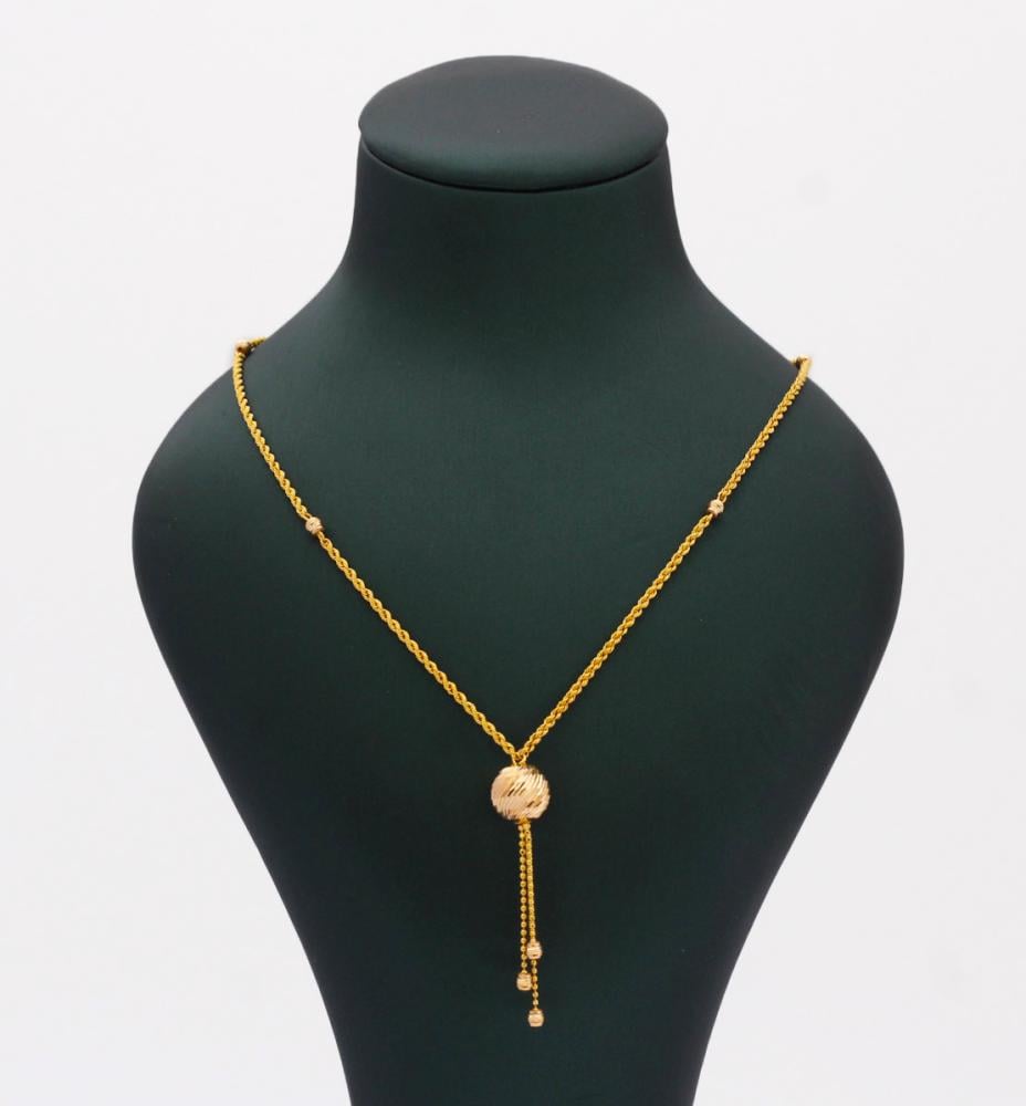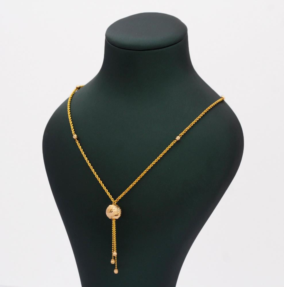 A pure gold necklace with a luxurious, eye-catching design, and an elegant length that flows on the neck with all its brilliance.